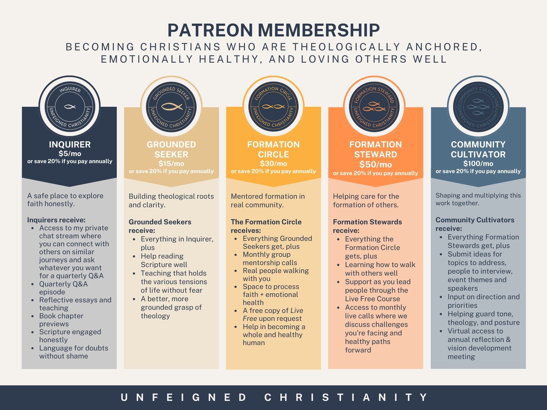 Become a paying member of Unfeigned Christianity for as little as $5/mo and access article, our community chat stream, and quarterly Q&A episodes.